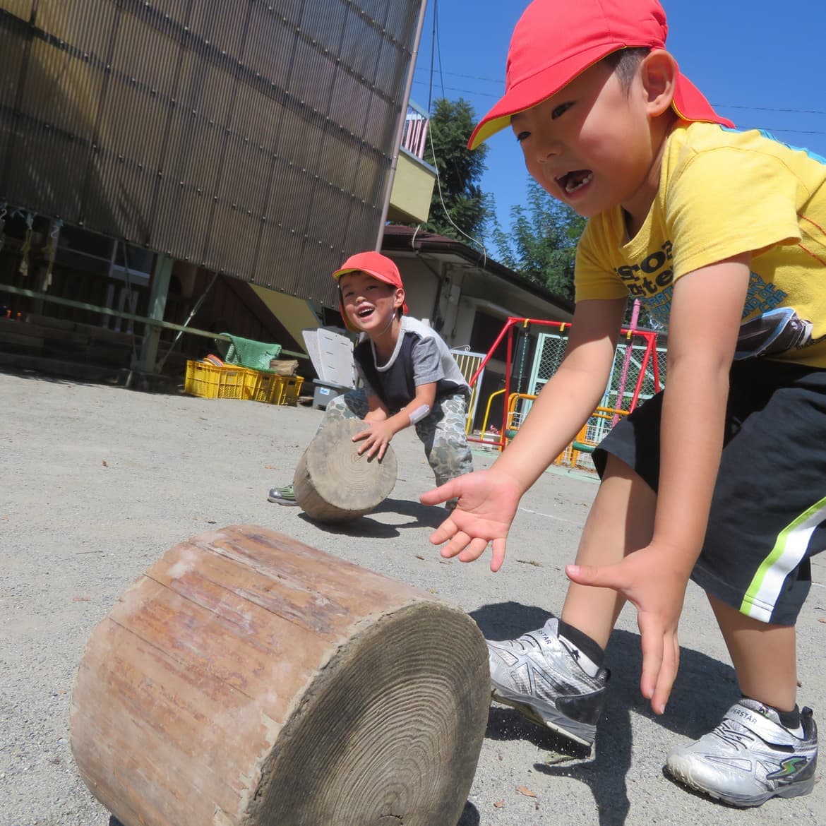丸太を転がして競争を楽しんでいます。どうやったらまっすぐ転がるかな?と作戦会議が始まりました。子どもたちにとっては身の回りにあるもの全てが素敵な遊び道具です。