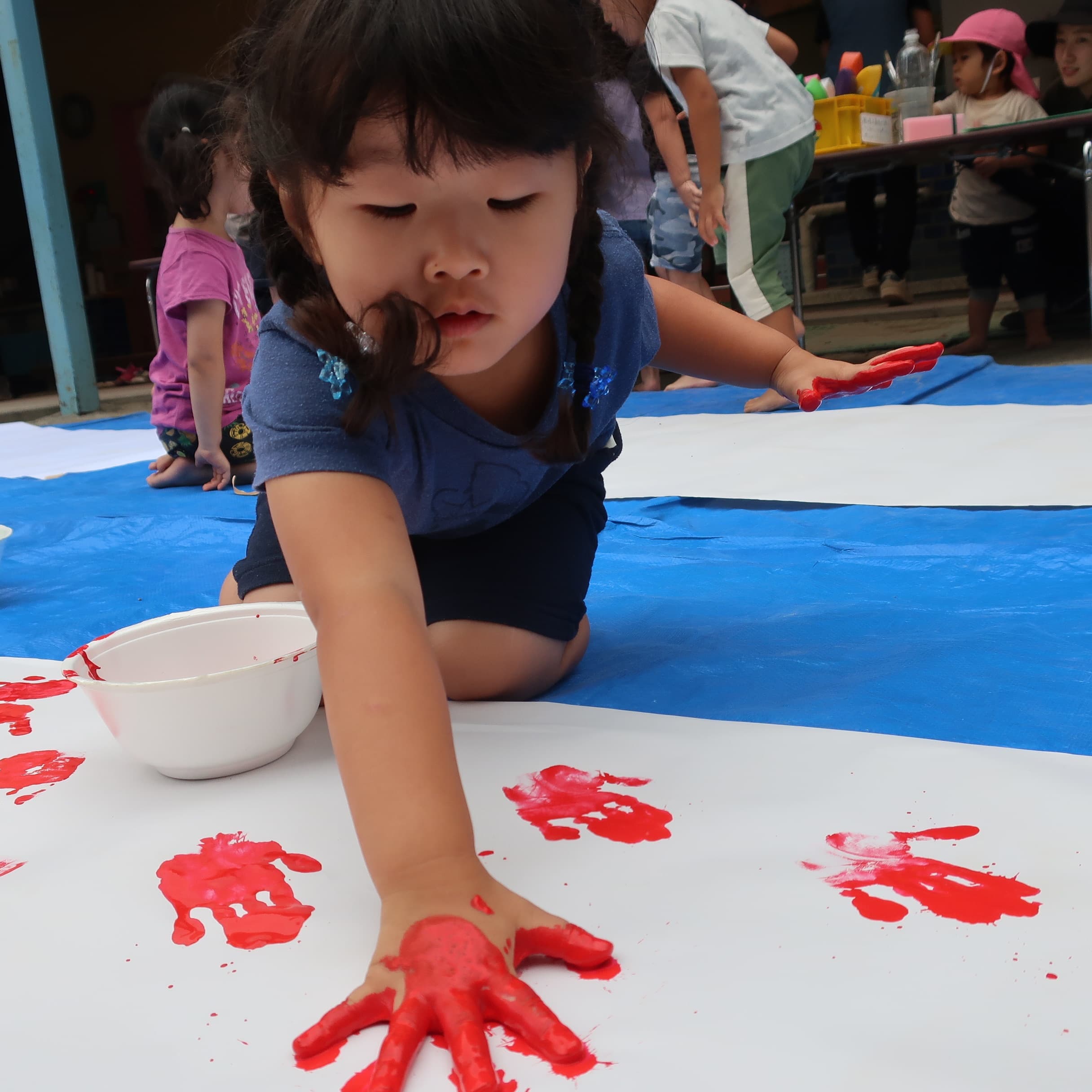 大きな紙の上で絵具遊びをしました。手足型を付けたり、手足で絵具の感触を楽しんだりしています。目をキラキラさせながら思い切り絵具遊びをしていた子ども達です。