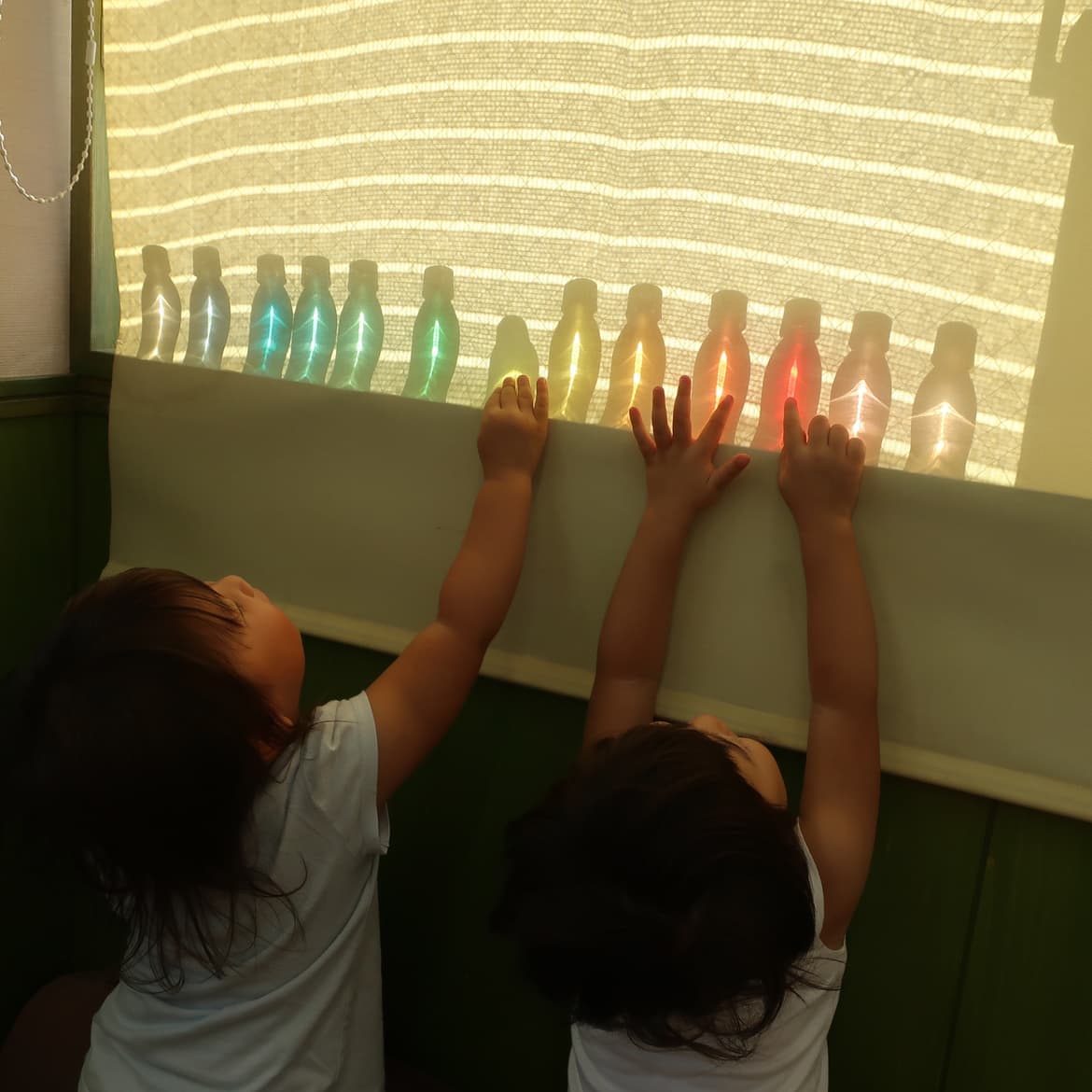 色水に太陽の光が当たり、ロールカーテンに虹が出現!?「虹に触れそう~」と精一杯背伸びして手を伸ばしていました。不思議さや面白さに出会った子どもたちの顔はきらきらです。