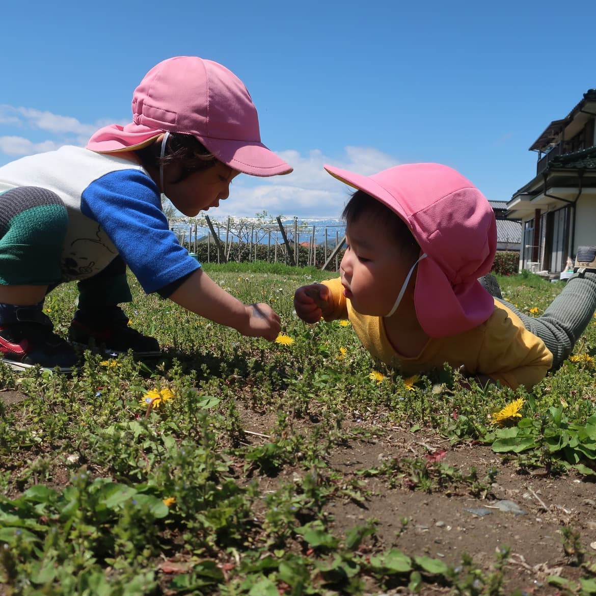 大好きな原っぱでの草花遊び。小さい子ども達にとってはひとつひとつが大きな発見です。これ何かなあ?と不思議そうに眺めたり手に取ったりしています。