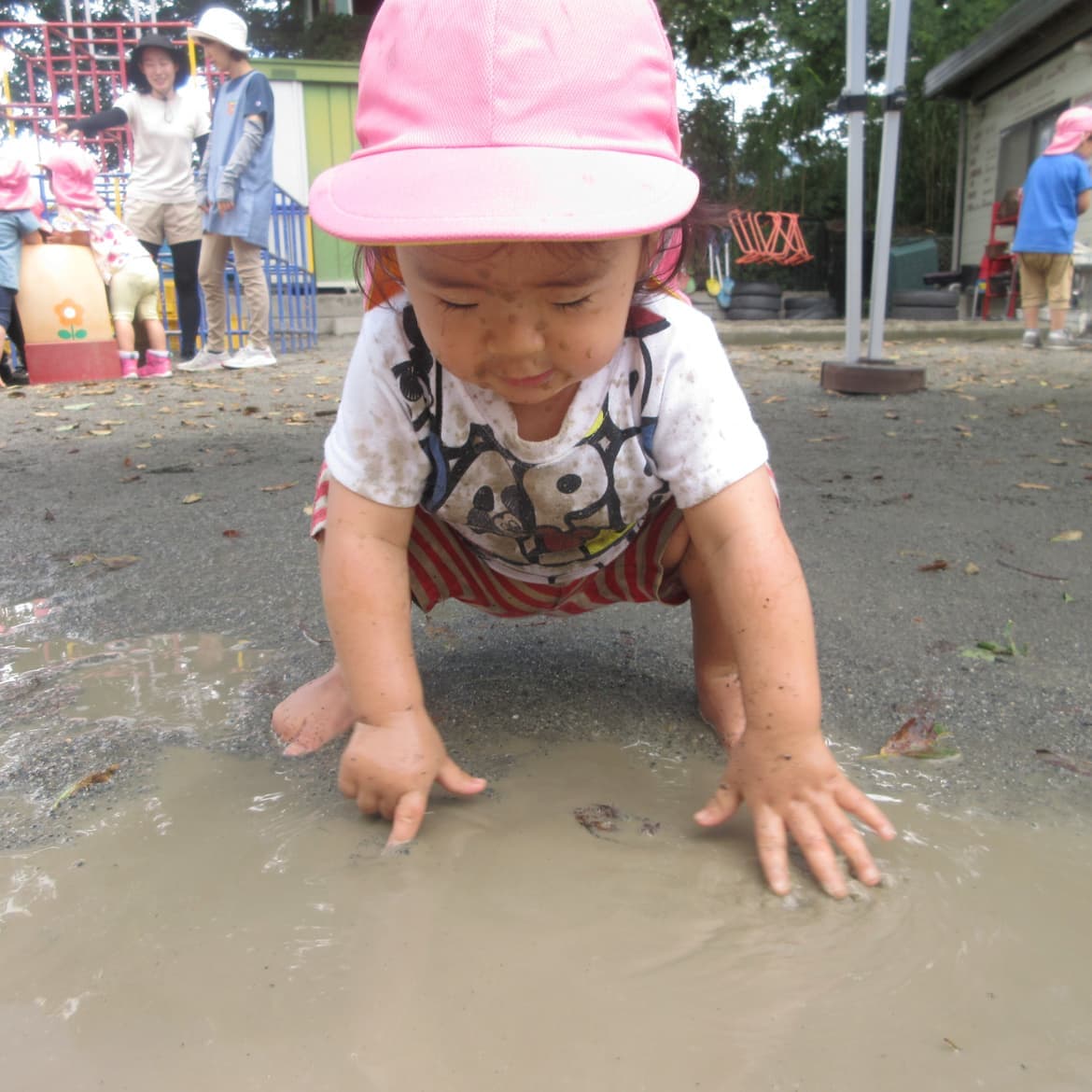 大きな水たまりを発見。手のひらや足の裏で泥や水の感触を楽しんだり、バシャバシャ水しぶきを浴びて顔に泥がついてしまうほど全身を使って遊んでいます。